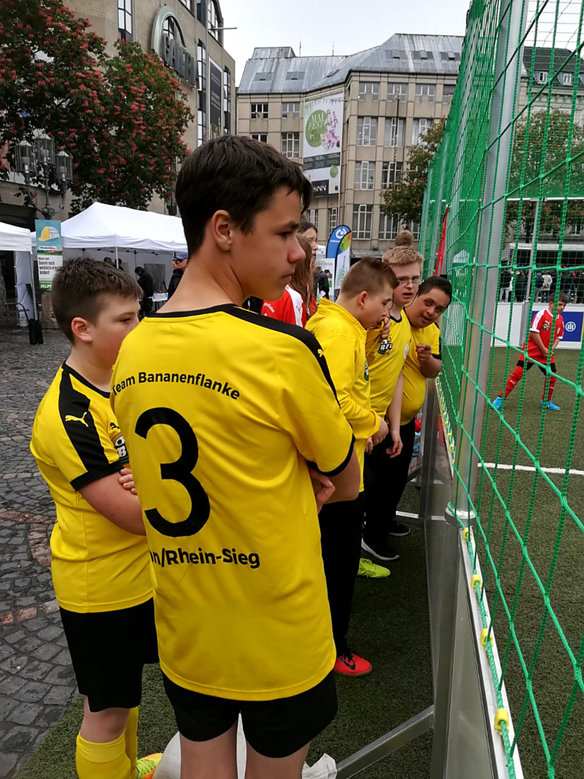 Langsam stieg die Anspannung der SpielerInnen den der Auftritt auf der Bühne stand kurz bevor. Schnell verflog die Anspannung auf der Bühne. Kleiner Wermutstropfen war das Wetter in Bonn es regnete daher waren nicht so viele Zuschauer anwesend wie die letzten Male. Aber wieder hat uns die Vorgebirgsschule gerettet. Nämlich zwei Klassen mit ihren Lehrern Sabine Will, Ferdinand Fendel und Mirco Wupper ließen es sich nicht nehmen die Bananenflanke vor der Bühne und auf dem Court anzufeuern. Herzlichen Dank dafür.
