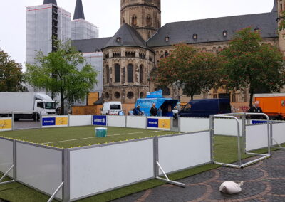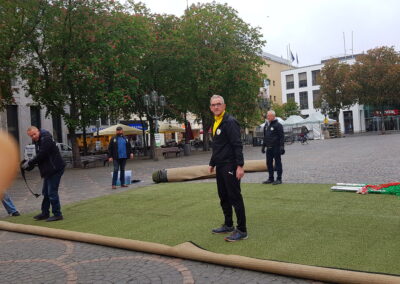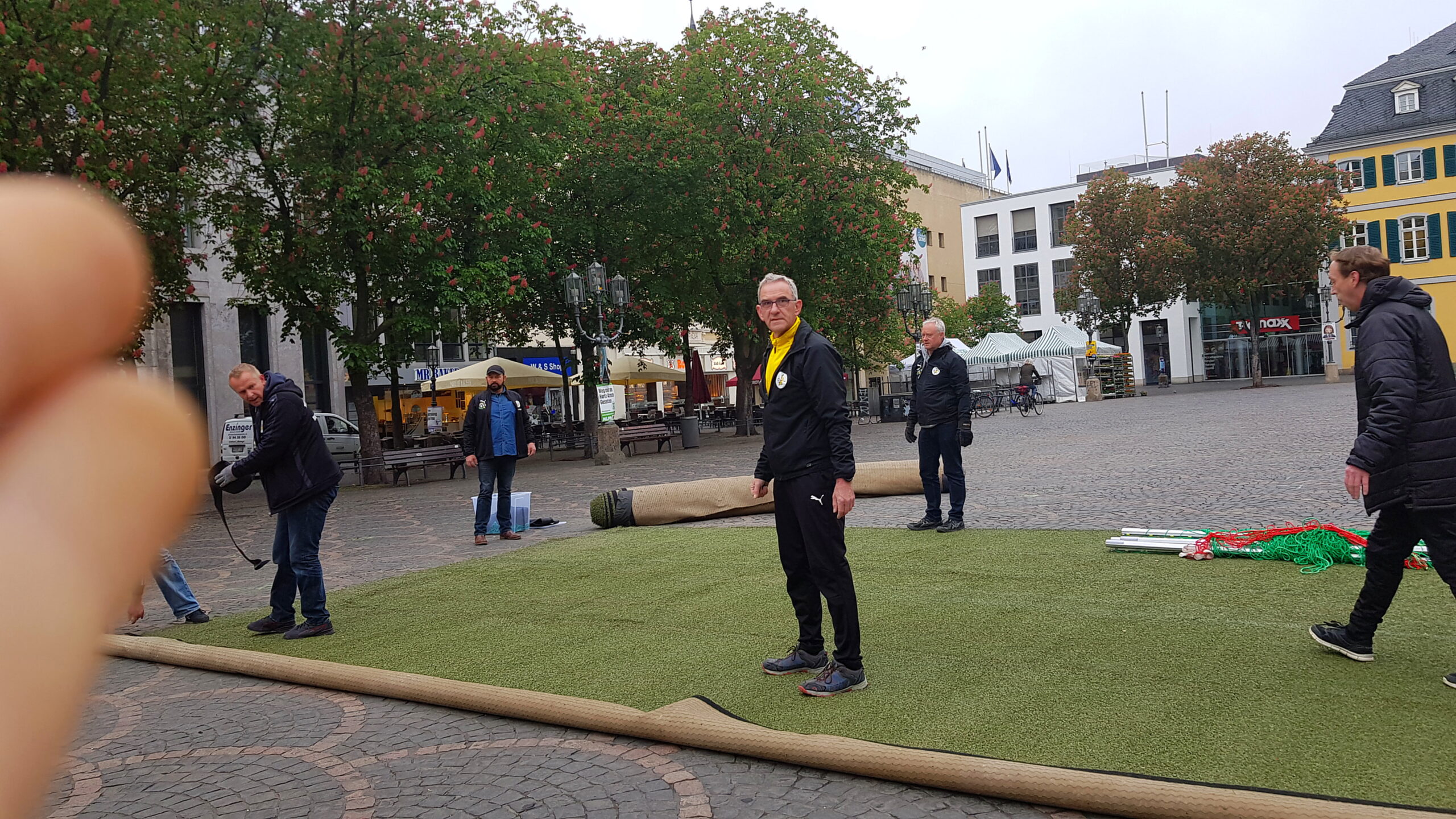 Der Aufbau hat ja schon eine gewisse Routine, doch das verlegen des Rollrasens ist immer eine Herausforderung, letztendlich wurde das Kopfsteinpflaster auf dem Münsterplatz besiegt.