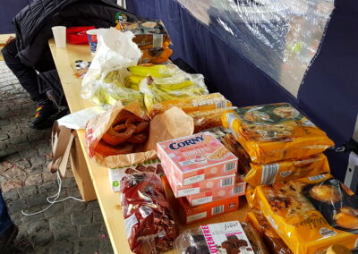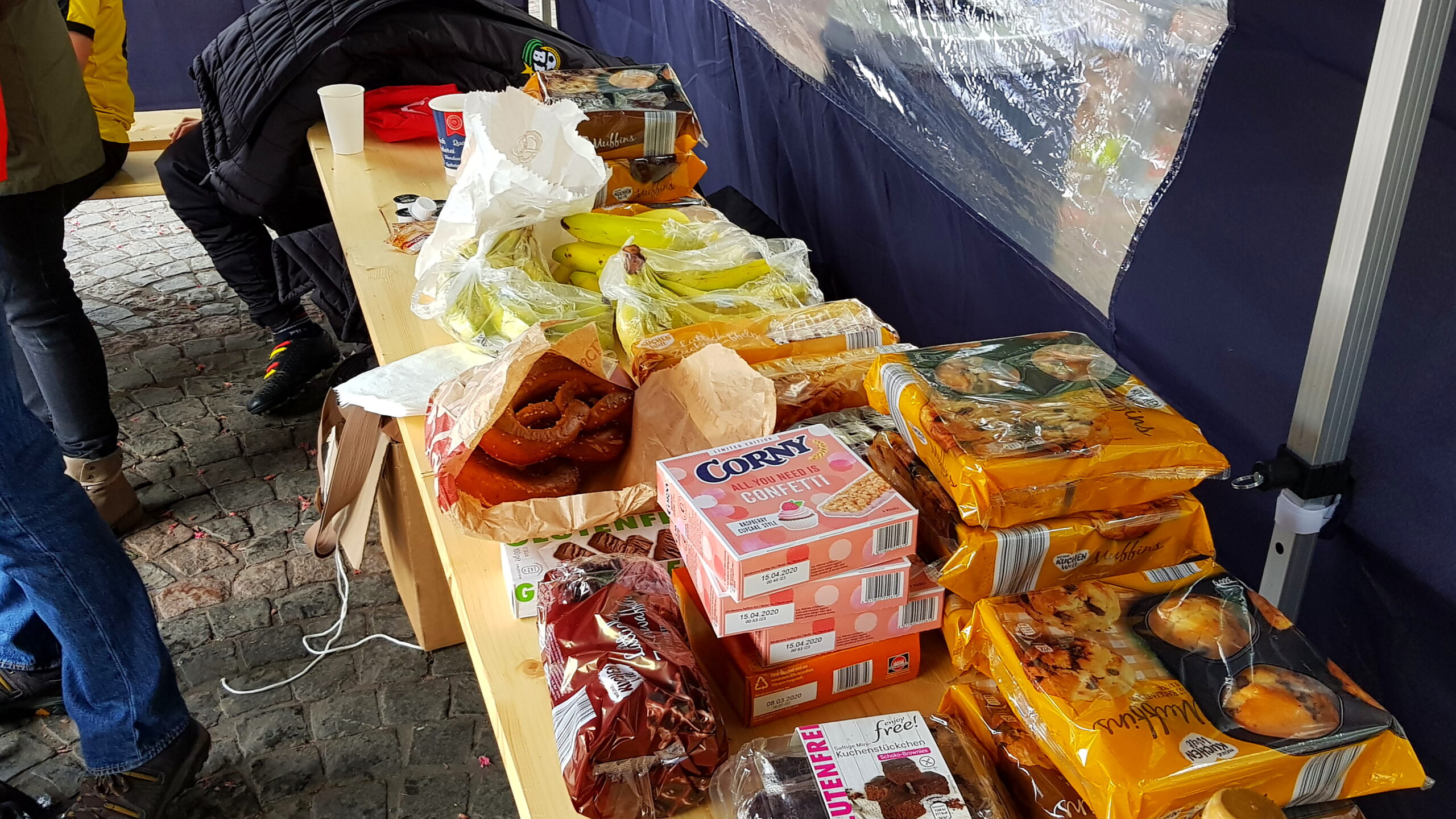Mittlerweile traf Lisa mit leckeren belegten Brötchen ein die mit einem Becher Kaffee veredelt wurden. Mit Alex kam eine weitere Mama zur Unterstützung unserer SpielerInnen. Alex und Lisa kümmerten sich darum, das die SpielerInnen die richtigen Trikots anzogen die Schuhe gut geschnürt waren und die Klamotten am richtigen Platz waren. Auch füllten die Beiden die neuen Trinkflaschen von unserem Sponsor Allianz. Weiter wurde ein kleines Büffet aufgebaut mit Obst, Getränken und essbarem.