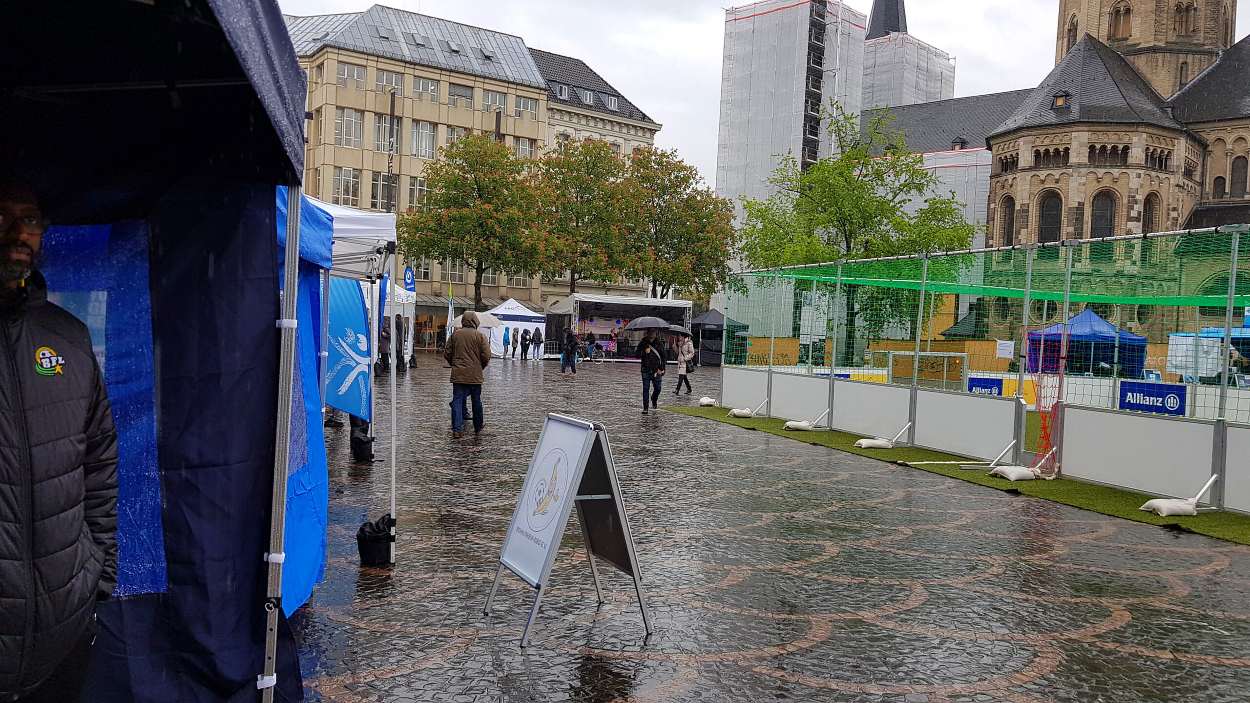 Scheinbar war dieser Zeitpunkt für Petrus das Zeichen die Schleusen im Himmel zu öffnen. Es gab keine Chance mehr um auf dem Court Fußball zu spielen. Man konnte nur noch aus den Pavillons hilflos zusehen und hoffen dass es bis zum Abbau besser wird.
