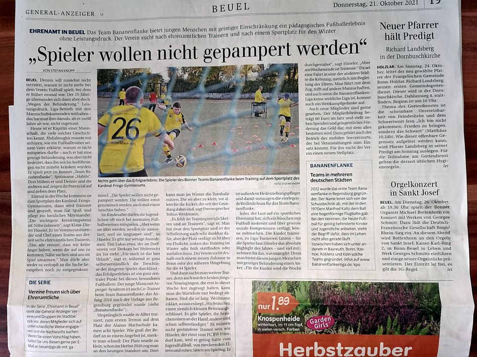 Heute am Donnerstag, 21. Okt. 2021 ist es endlich so weit. Es ist ein lesenswerter Artikel geworden. Herzlichen Dank lieber GA mit Namen Stefan Knopp das Sie die Bananenflanke Bonn/Rhein-Sieg der Öffentlichkeit präsentiert haben. Mit diesem Artikel soll ja das Ehrenamt gewürdigt werden. Das nicht so oft Erwähnung erfährt.