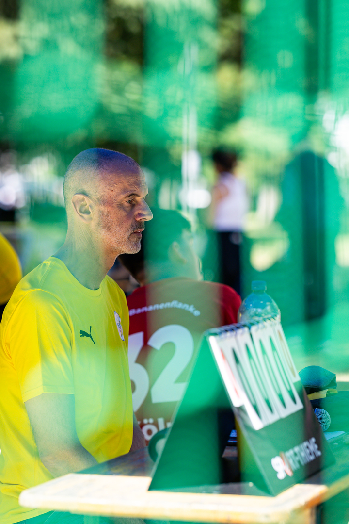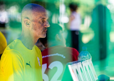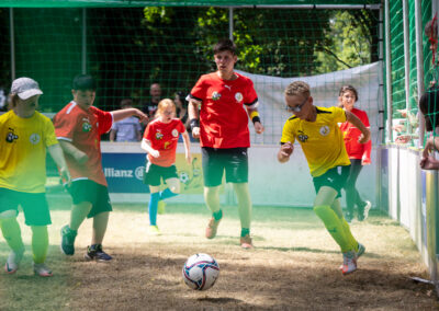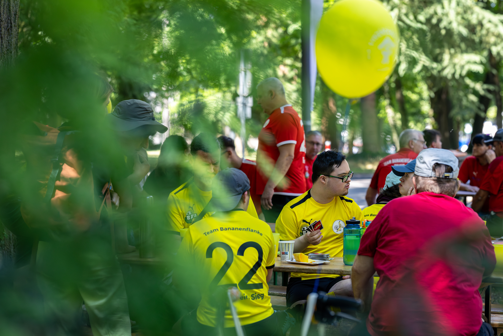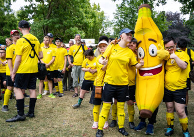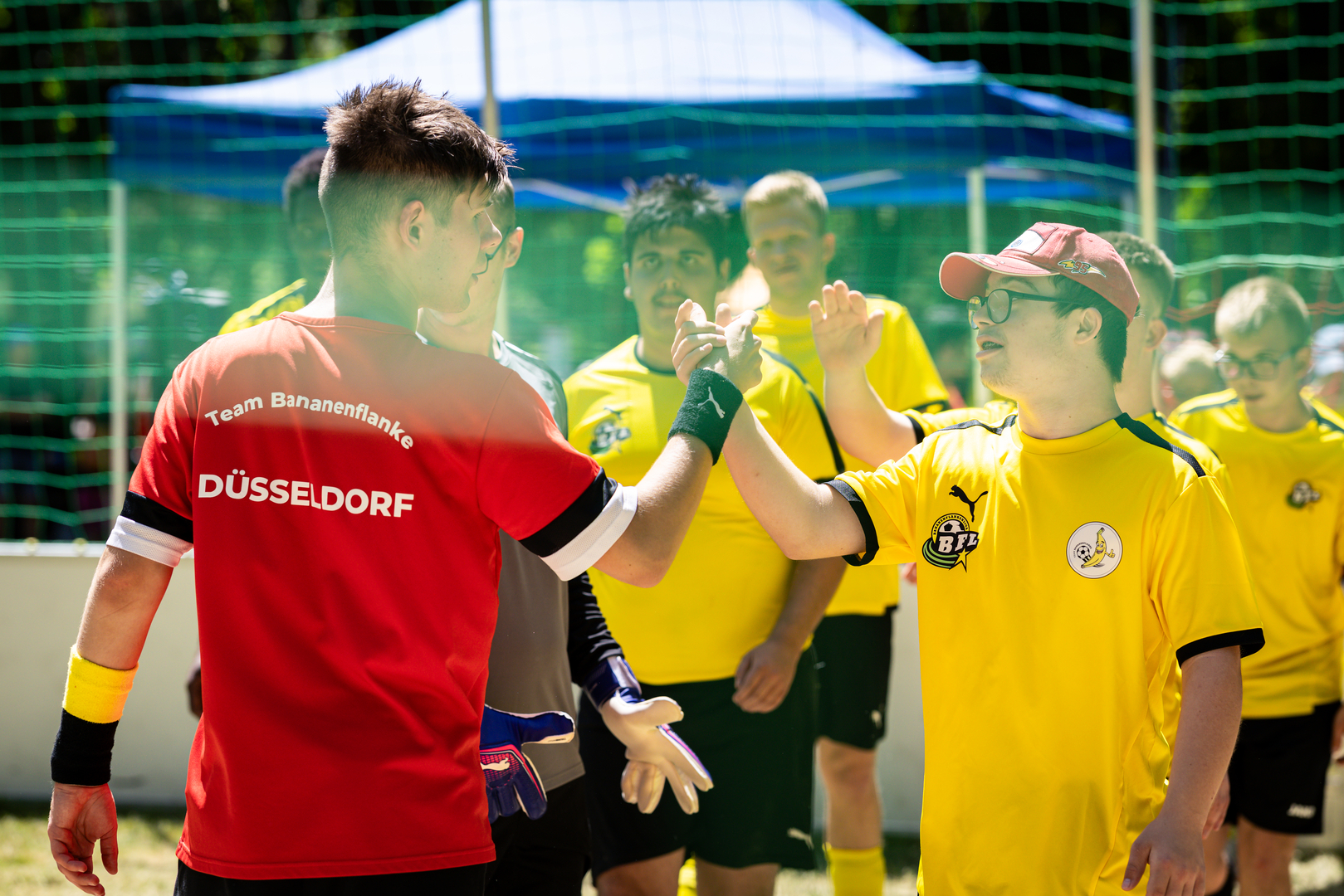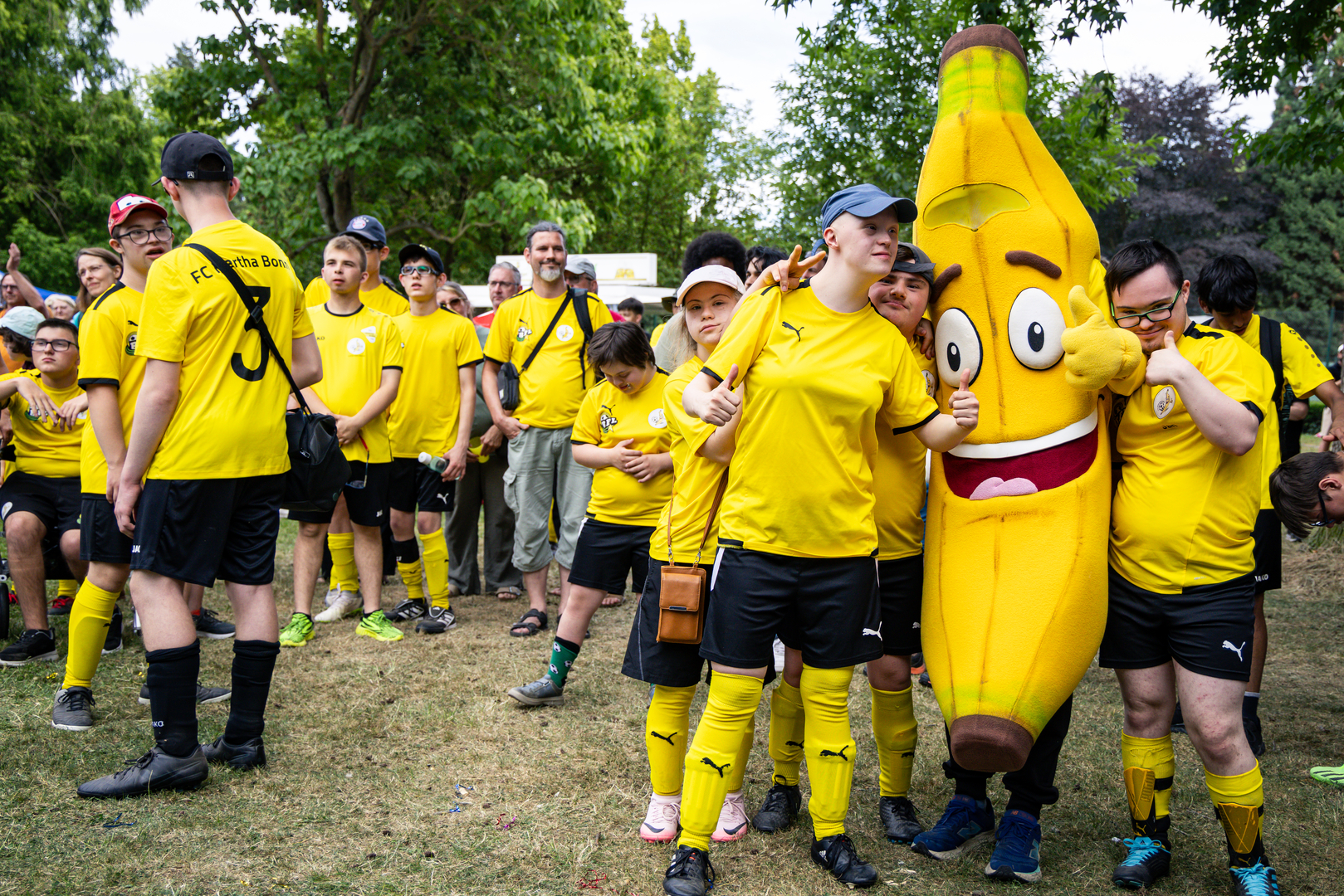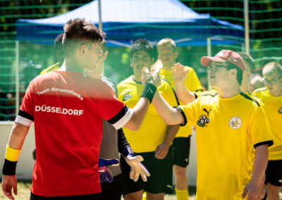 Gleich im ersten Duell zwischen den großen Jungs aus Düsseldorf und Bonn erhitzten sich die Gemüter ein wenig. Allen war der unbedingte Wille anzumerken, ein erfolgreiches Turnier zu spielen. Das wollten sie gleich im Eröffnungsspiel allen zeigen – wie die Nationalspieler bei einer Weltmeisterschaft! Die Enge des Soccercourts trug nicht gerade zur Beruhigung bei, da durch die umlaufenden Banden der Ball eigentlich nie ruht. Diese beiden Faktoren hat die Spieler ganz schön gestresst. Aber wir wären nicht die viel zitierte „Bananenflanken-Familie“, wenn wir das nicht freundschaftlich klären könnten! Also gab es ein kleines Spontan-Meeting mit allen Trainern, in denen die Verkleinerung auf 3 Feldspieler beschlossen wurde. In Verbindung mit einfühlsamen Ansprachen der Trainer an ihre Teams konnten wir für den weiteren Turnierverlauf feststellen, dass die Spielerinnen und Spieler sehr fair und rücksichtsvoll miteinander umgegangen sind, der Stress des ersten Spiels war verflogen. Alle Verantwortlichen waren sehr stolz auf die Reaktion der Bananenflanker. Wie heißt es so schön in unserer Hymne? „Wir sind nicht anders – wir sind besonders.“